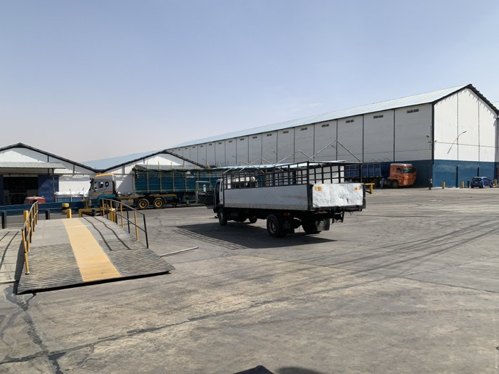 The image depicts an industrial or commercial facility in Babawa, Nigeria, under a clear daylight sky. The scene is dominated by a large, paved asphalt or concrete lot showing visible tire tracks. In the foreground, to the left, is a dark-colored vehicle scale or ramp with yellow anti-slip stripes in the center and yellow guardrails on both sides, inclined upwards from left to right. Immediately to its right, a light-colored flatbed truck with an open, dark-colored cage bed is positioned, facing away from the viewer. The rear of the truck displays some wear and minor damage. In the mid-ground, to the left, a large, light-colored truck with a blue-green tarp or container on its bed is parked near a building with a light-colored roof and blue accents. Further back, on the right side of the frame, is a long, single-story warehouse building with white walls and a distinct dark blue band along its lower section. Its roof is light-colored. Parked in front of this main warehouse building, further back in the mid-ground, is an orange truck. To the far right, two blue passenger cars are parked against the warehouse wall. One individual is visible standing near the orange truck. Several yellow bollards and tall lamp posts are distributed across the paved area.