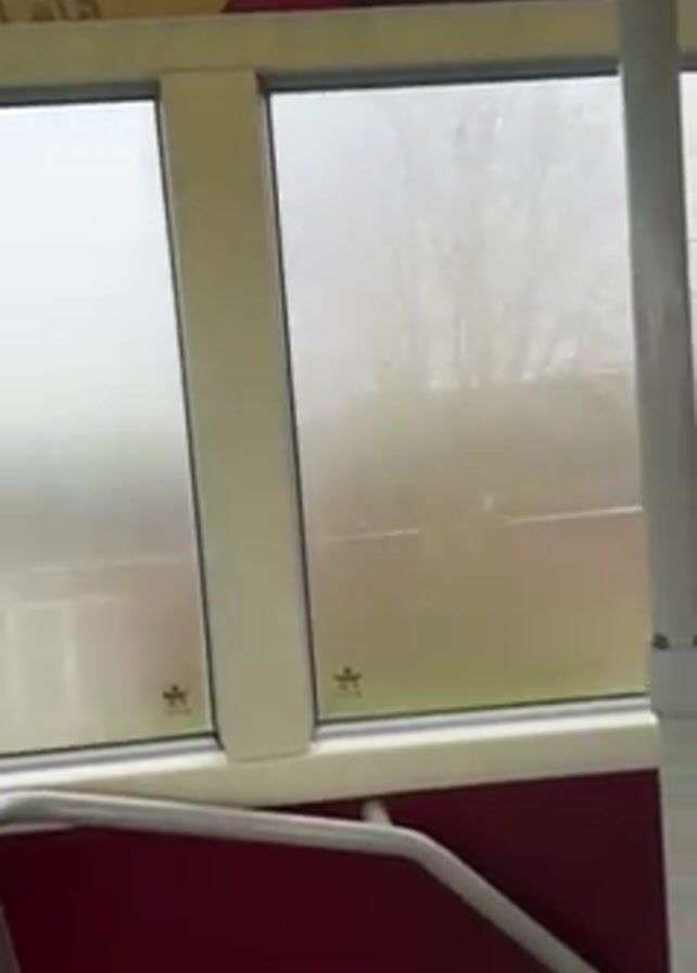 view from inside a bus. The window reveals a foggy outdoor scene. The bus interior features white window frames and a red panel below the window. A white pole stands near the window, and a seat is partially visible. The bus has an advertisement above the window.