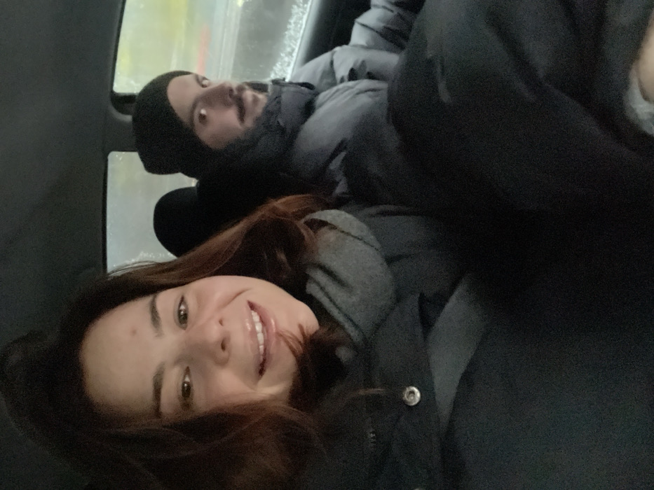 A photograph taken inside a vehicle shows two individuals. In the foreground, a female with dark brown hair is visible from the chest up, smiling directly at the camera. She wears a dark winter coat with silver snap buttons and a grey scarf. A seatbelt diagonally traverses her chest. To her right and slightly behind, a male subject is visible, looking over his right shoulder towards the camera. He wears a black knitted beanie, has a dark beard and mustache, and is dressed in a light-colored puffer jacket. The vehicle's interior is dark, with a light-colored headliner and black headrests. Through the window on the male's side, precipitation is visible on the glass, and blurred external lights, including a distinct red horizontal streak, indicate an urban environment under low light or adverse weather conditions. The scene is situated in the city of Tourcoing, France.