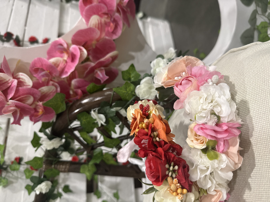 The scene depicts a static, decorated indoor environment located in Lupanovo, Russia. In the immediate foreground, a multi-colored artificial flower crown, composed of red, orange, white, pink, and peach blossoms with small yellow and white berry-like accents, rests on a light beige, woven textile surface. Behind this, a dark brown, curved structure, resembling a wooden arch or trellis, is visible, extensively entwined with artificial green ivy vines and small white and red floral accents. Further in the background, a white horizontally-slatted panel serves as a backdrop. To the right, a large arrangement of vibrant pink artificial orchid blossoms descends into the frame, partially obscuring a curved white object. The lower right portion of the image shows a dark, reflective surface. No individuals, actions, or direct interactions are observable. The environment is heavily adorned with artificial flora.