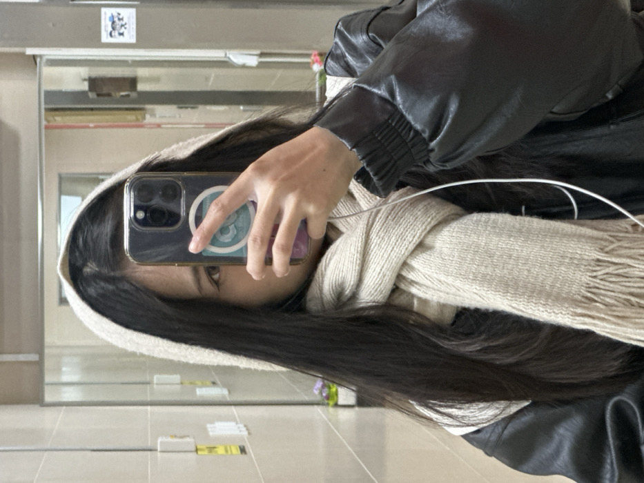A person takes a mirror selfie, partially obscured by their phone. The phone, held in the right hand, has a clear case with a round object attached. The subject wears a black leather jacket over a hooded, neutral-colored sweater, layered with a woven scarf. Long, dark hair frames their face. Reflections show a bathroom interior, including a mirror, tiled walls, and various objects on the counter. The image is vertically oriented.