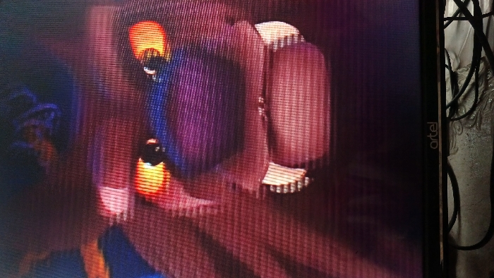 The scene is located in Kasansay, Uzbekistan. The image depicts a close-up, head-on view of a digital display, specifically an "artel" brand television, as indicated by the logo on its lower bezel. The screen exhibits prominent horizontal scan lines and displays a digitally rendered, animated face of a creature or character. This character features two large, glowing orange eyes with dark pupils, positioned above a prominent dark purple snout/nose area. Below the snout, a mouth is visible, revealing large, white, elongated teeth or fangs on the lower jaw, with a reddish-brown interior or tongue. The surrounding facial area is predominantly reddish-brown, appearing textured like fur, with areas of dark blue and yellow-orange visible in the upper frame, suggesting a headpiece or background elements. Below the television screen, a cluttered arrangement of dark electrical cables rests on a textured, light-colored surface, possibly a decorative table or stand. No human figures are visible.