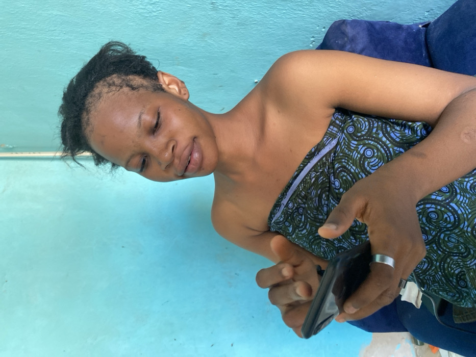 young adult female seated indoors against a light blue painted wall in Minna, Nigeria