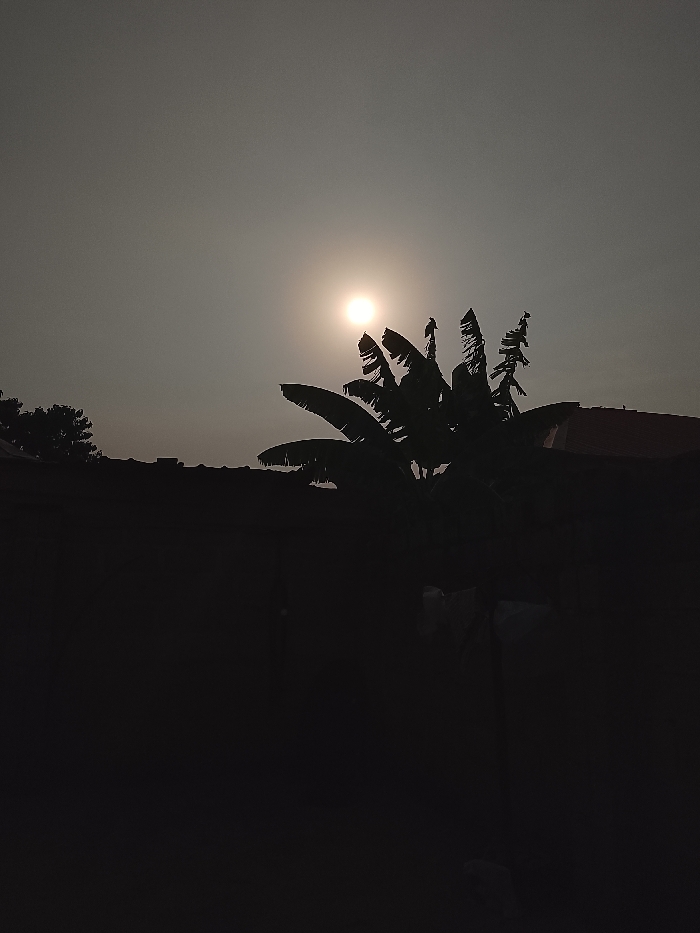 The image depicts an outdoor scene in Lafia, Nigeria, characterized by strong backlighting during either sunrise or sunset. A bright, circular sun is positioned against a light gray, hazy sky, which occupies the upper two-thirds of the frame. In the right-middle ground, a large, multi-stemmed plant, consistent with a banana tree, is silhouetted in black, its broad leaves clearly visible. At least two small, dark avian figures are perched on the upper leaves of this plant. To the far left, a smaller tree or bush is partially visible as a dark silhouette. Below the vegetation, a dark, linear structure, likely a wall, extends horizontally across the lower frame. A faint reddish-brown sloped rooftop is discernible above this structure on the far right. The immediate foreground and lower portions of the scene are underexposed, appearing in deep shadow. No human subjects are visible.