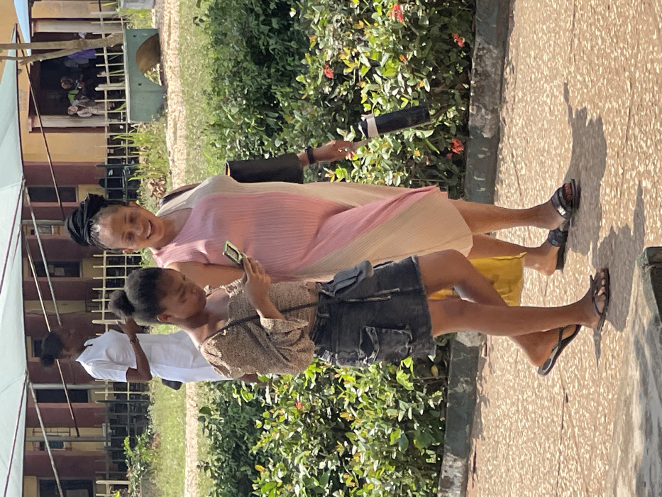 The image displays an outdoor scene in the city of Uturu, Nigeria, on a sunlit day. Three women are visible, with two in the foreground walking on a paved pathway from left to right. The woman on the left, of slender build, wears a light-colored textured off-the-shoulder top, a dark denim mini-skirt with cargo pockets, and dark flip-flop sandals. She holds a light-colored smartphone in both hands, actively observing its screen. A dark crossbody bag hangs over her shoulder, and a yellow bag is partially visible near her left leg. The woman on the right, with a fuller figure, wears a sleeveless, V-neck, pleated midi-dress featuring diagonal sections of pink, beige, and white. She wears dark slide sandals. She carries a dark shoulder bag on her left side and a black cylindrical object in her right hand. Her dark hair is styled in a high bun. She is smiling and looking towards the left. In the mid-background, a third woman, dressed in a white short-sleeved uniform top and white pants, walks rightward, looking down. The background features a multi-story building with reddish-brown walls and light-colored architectural elements. A white railing or fence-like structure is visible in front of the building. Lush green bushes with small red flowers line the paved pathway on the right. Several indistinct figures are present under a covered section of the background building. The strong sunlight casts distinct shadows on the paved ground.