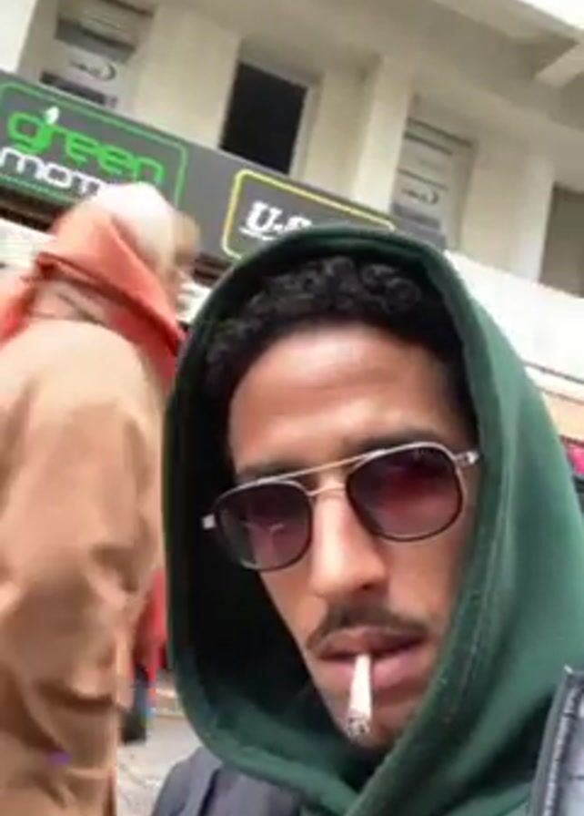 A man with sunglasses and a green hoodie is holding a cigarette in his mouth. He appears to be recording a selfie-style video. Behind him, there is a store with a "Green Motion" sign. A person in a brown robe and red head covering walks behind him in the distance. The surroundings seem to be an urban street setting.