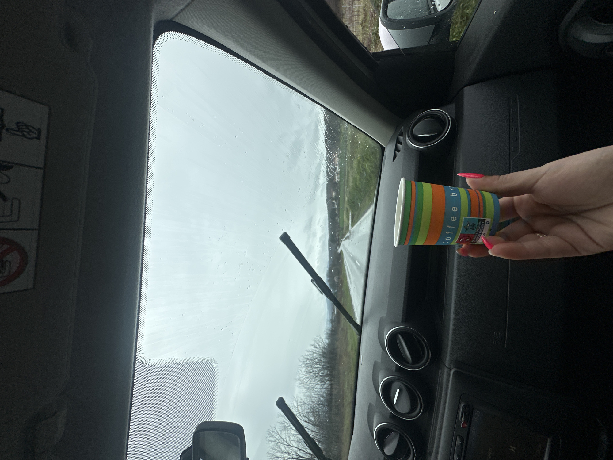 interior of a car, specifically the dashboard and windshield. The dashboard is black and features air vents and a radio. A hand holds a paper coffee cup in front of the dashboard. Outside the windshield, the wipers are visible, as well as a view of a wet road, trees, and fields under a cloudy sky. The location is Sungurlare, Bulgaria. No further information about the environment is visible.