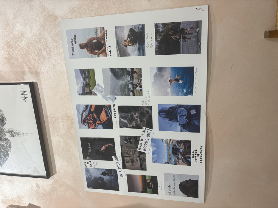 A vision board, approximately 120 cm wide by 80 cm high, is mounted on a textured light peach-colored wall inside a building in Sofia, Bulgaria. The board is white and displays 15 photographs and multiple text snippets, predominantly in black ink. A red pushpin secures the bottom right corner. Above the vision board, a black-framed artwork, roughly 60 cm wide by 40 cm high, hangs centrally. This artwork features a black and white stylized illustration, possibly an anatomical diagram or abstract shape, with two distinct "M" symbols or electrocardiogram patterns printed in the bottom right corner. The vision board content includes: * **Top Row (left to right):** A runner in a misty environment with "BRICK BY BRICK" and "ON A MISSION"; a muscular man with "but i will"; a luxury car interior with orange upholstery; a modern house with expansive glass; and a shirtless man (Conor McGregor) by water with "Trust your vision." and "dont wish for it, WORK FOR IT". * **Middle Row:** A sunset scene with "NO EXCUSES!"; a flat lay of cash and a watch with "WHAT IF IT ALL WORKS OUT?"; a waterfall with "1% chance" and "99% FAITH"; a group of people by a lake with "GOD FOCUS DISCIPLINE"; and two individuals on a jet ski with "Can't Rush Greatness.". A crumpled paper note reading "trust the process" is affixed diagonally across the middle right. * **Bottom Row:** A man's portrait with "Kill the boy. And let the man be born."; a person working on a laptop outdoors with "FUCK AVERAGE BE LEGENDARY"; a close-up of a person in a helmet and goggles; a man diving into water with "It's the little things, always."; and a man and woman embracing on a tennis court. The wall surface exhibits minor imperfections and slight discoloration. No other furniture or objects are clearly discernible, though a faint wooden edge is visible at the extreme bottom of the frame, below the vision board.