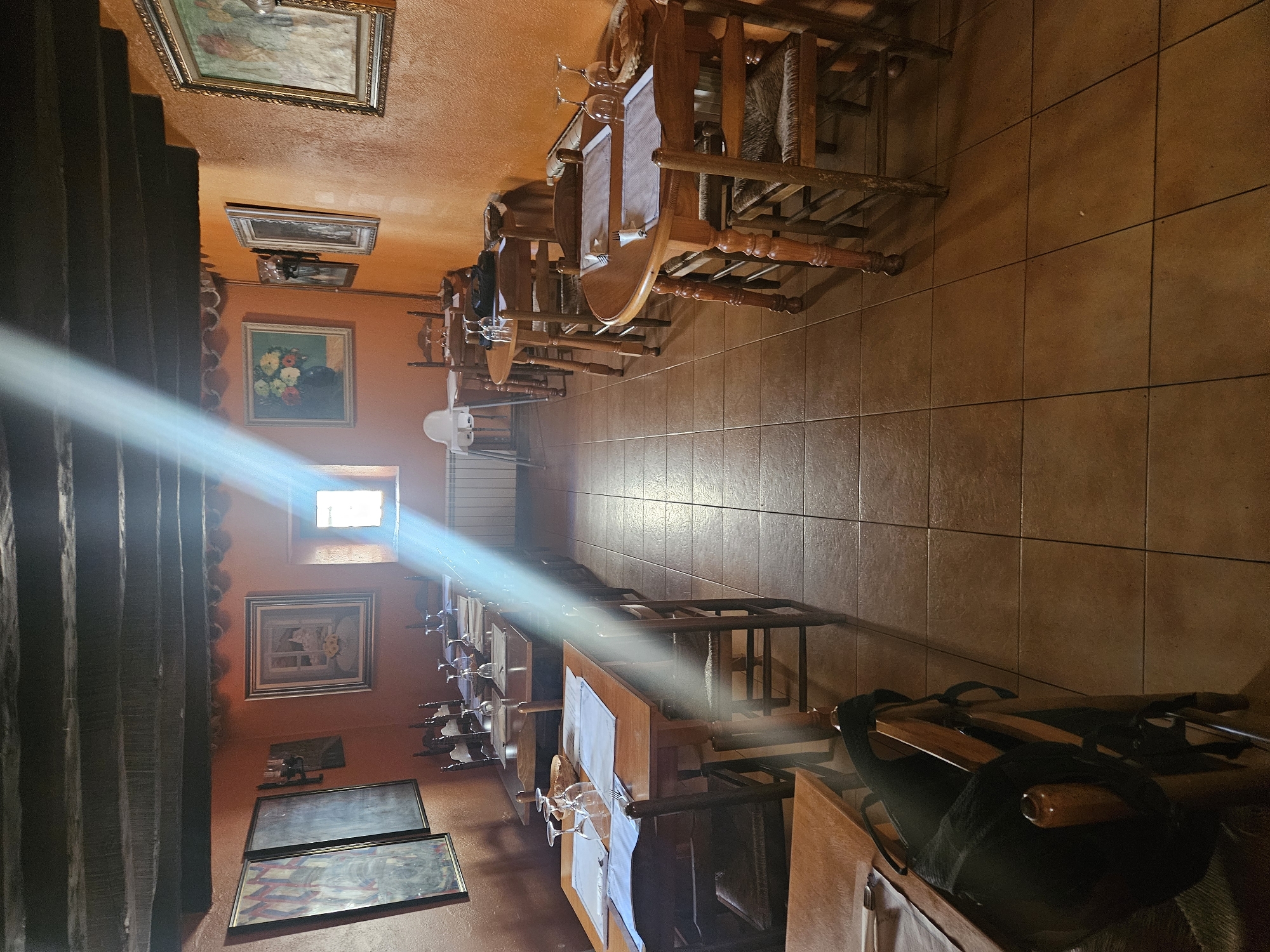 The image displays the interior of an unoccupied dining establishment in Mas Aliu, Spain. The room features textured, burnt orange walls and a dark wooden beamed ceiling. The floor is covered with light brown square tiles. Two rows of wooden tables, consisting of both rectangular and round forms, are arranged to create a central aisle. Each table is prepared with white paper placemats, at least two clear wine glasses, and cutlery. Several tables include small, light-colored woven baskets. Wooden chairs with woven seats are positioned around the tables; some feature ornate high backs. A black backpack rests on a chair in the lower left foreground. A white plastic high chair is visible against the far wall on the left. Multiple framed artworks hang on the walls, depicting subjects such as floral still lifes and framed window scenes. A small, rectangular window on the back wall admits bright natural light, creating a distinct vertical light beam through the center of the room. A white radiator is installed directly below this window. No individuals are present within the scene.