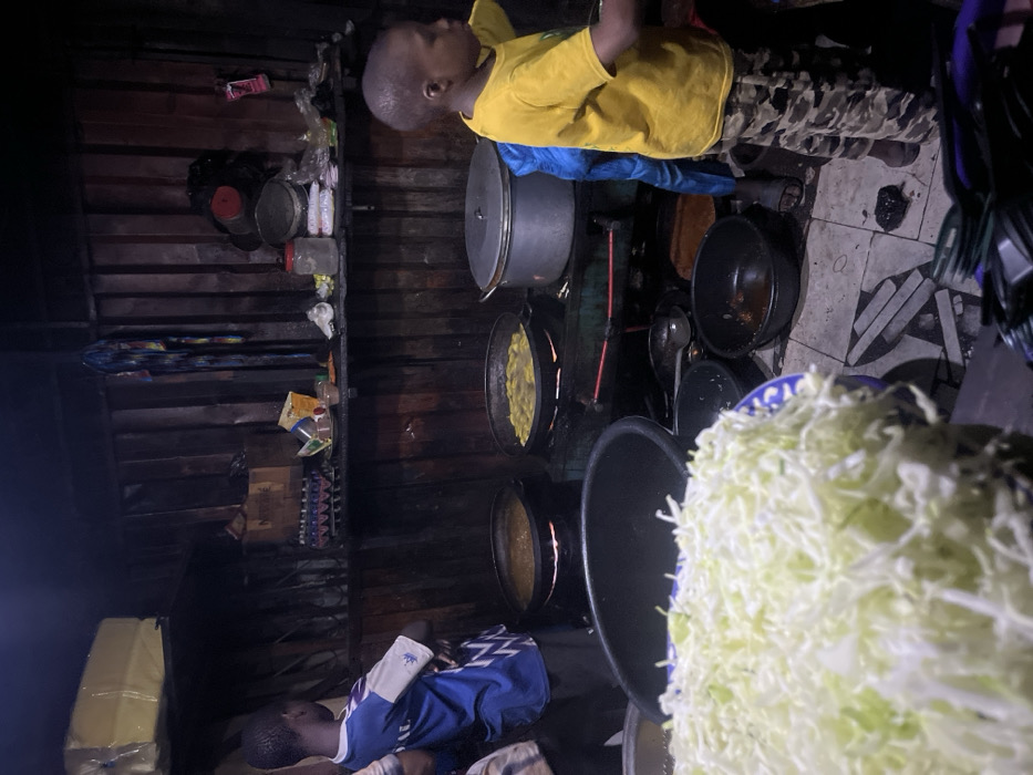 An indoor scene features a child in a yellow shirt and camouflage pants standing next to hanging pots and pans. A bowl of shredded cabbage sits in the foreground. Another child in a blue shirt lies on the floor in the lower left. A shelf cluttered with containers and household items runs along the back wall. The floor appears to be tiled. The lighting is dim, and the image is taken from a high angle.