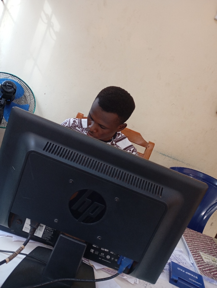 A young man sits behind an HP computer monitor. A blue fan is mounted on the wall behind him. He wears a patterned white and brown shirt. A blue stamp pad is visible on the desk to the right of the monitor. Papers and a notebook are also on the desk. The background wall is light beige. A blue plastic chair is partially visible.