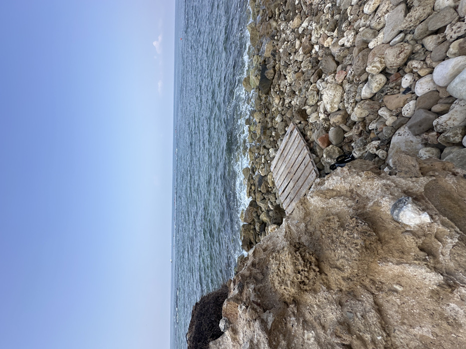 A coastal scene featuring a rocky shoreline, the sea, and a blue sky. The foreground is dominated by large rocks and pebbles, with a weathered wooden pallet resting among them. The sea extends towards the horizon with small waves breaking on the shore. The sky above is clear and blue. Vegetation appears in the lower left corner of the frame near the rock face.