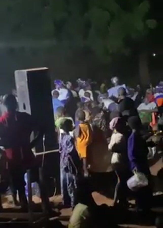 A medium shot of a large crowd of people outdoors at night. Most of the crowd is standing in the center of the shot, while a few people are milling around at the bottom of the frame, in front of a large speaker. Most of the people in the crowd are wearing white shirts and blue head coverings, some with patterns. There are also many children scattered throughout the crowd, dressed in casual clothing in various colors. Most of the people are facing forward and appear to be dancing or moving to music coming from the speaker. The ground is brown and appears to be dirt. In the background are several trees. The lighting is poor and the image is somewhat grainy.