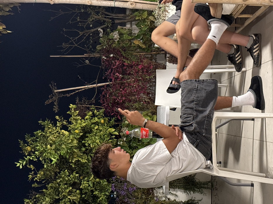 The image depicts an nighttime scene on an outdoor patio or rooftop terrace in what appears to be an urban setting, consistent with Tel Aviv, Israel. **Environment:** The space is illuminated by artificial light, revealing several potted plants and small trees, including a citrus tree bearing green fruit on the left, and shrubs with reddish and green foliage. A dark sky is visible above. White outdoor furniture, consisting of a rectangular table and at least two chairs, is present on a light-colored tiled or paved surface. A multi-sectional wooden or bamboo-like support structure is visible on the far right. **People:** 1. **Subject 1 (Left):** A young male, facing right in profile, is seated on a white chair. He has short, curly dark hair and is wearing a white short-sleeved t-shirt, dark grey denim shorts, white socks with dark trim, and black slip-on shoes. His right hand holds a smartphone, which he is actively looking at. His left forearm rests on the table, and a bracelet is visible on his left wrist. 2. **Subject 2 (Right):** Only the lower half of this individual is visible. This person is seated, with their left leg crossed over their right. They are wearing light-colored shorts. Their left foot wears a black sandal, and their right foot wears a black sneaker with white stripes (resembling Adidas Gazelle) over a white sock. **Objects and Interactions:** A red plastic Coca-Cola bottle rests on the white table between the two subjects. No direct interaction is visible between the individuals; the first subject is engrossed with their smartphone.