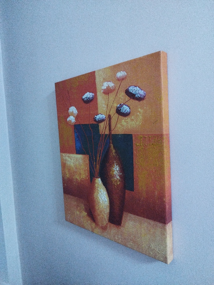 A rectangular canvas painting is displayed vertically on a light gray interior wall. The painting, observed from an oblique angle, features an abstract still life composed of two stylized vases holding slender-stemmed flowers. The left vase is a shorter, ovoid shape in a textured light gold or cream, while the right vase is taller and more slender, appearing in a textured dark brown or reddish-brown. From these vases, multiple thin, dark stems extend upwards, culminating in various spherical flower heads. Some flower heads are predominantly white with texture, while others are dark purple or brown with white, textured highlights. The background of the painting consists of geometric blocks of color, primarily warm tones of orange, gold, and reddish-brown, with a notable dark blue or deep teal rectangular section behind the vases. Visible texture suggests impasto techniques within the artwork. No individuals are present. The scene is situated within a building in Varna, Bulgaria.