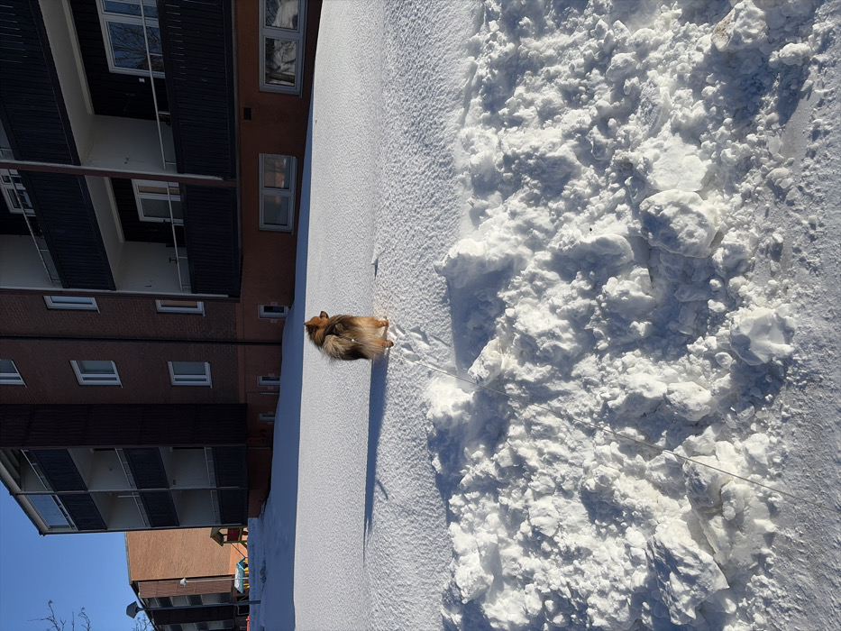 The image displays an urban residential scene in Kiruna, Sweden, covered in snow under a clear blue sky. A small, fluffy, tan-and-brown dog, consistent with a Pomeranian-type breed, stands in the midground, facing away from the camera and looking towards the right. It leaves paw prints in the untouched snow behind it. A thin, light-colored leash trails from the dog's rear, extending downwards and disappearing into a large, irregular mound of plowed snow that occupies the lower foreground. In the background, two multi-story apartment buildings constructed of reddish-brown brick are visible. The building on the right features multiple dark-railed balconies and white-framed windows, with a lighter orange-peach colored lower facade. A second, similar building is partially visible to the left. Between the buildings, a children's playground structure with yellow and red components is discernible. Long shadows cast by the dog and buildings indicate direct sunlight from a low angle.