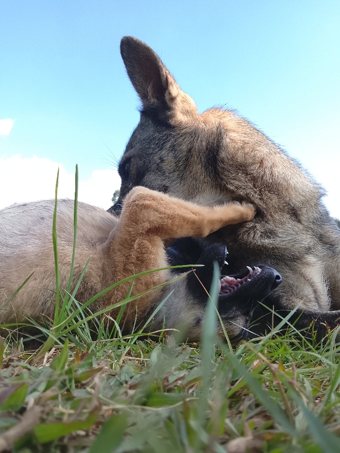 - "This image depicts two canids engaged in playful interaction on a grassy surface within the Mahiakalo ward, Kenya" by FM-oMmgr2, licensed under CC BY 4.0