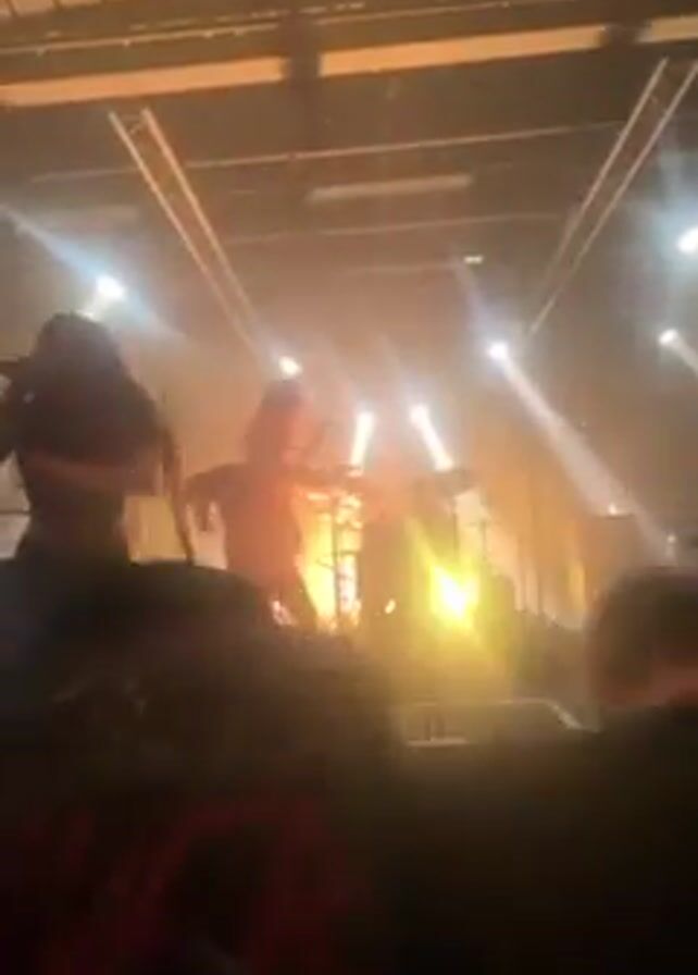 A band performs on a lit stage in front of a crowd, captured from the crowd's perspective. The stage lighting is bright, with beams illuminating the performers. The lead singer, silhouetted against the lights, engages with the audience. Other band members are visible behind him. The crowd is visible in the foreground, with hands raised. The venue appears to be an indoor space with a high ceiling and exposed structural elements. The video has a slightly shaky quality, likely due to the movement of the person filming.