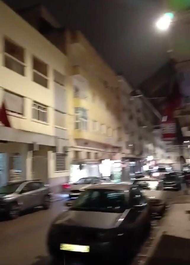 The video depicts an urban street at night. Cars are parked along the side of the road. The road is lit by street lights. Buildings line both sides of the street. A Moroccan flag is visible, hanging from a building. People can be seen walking on the sidewalk.