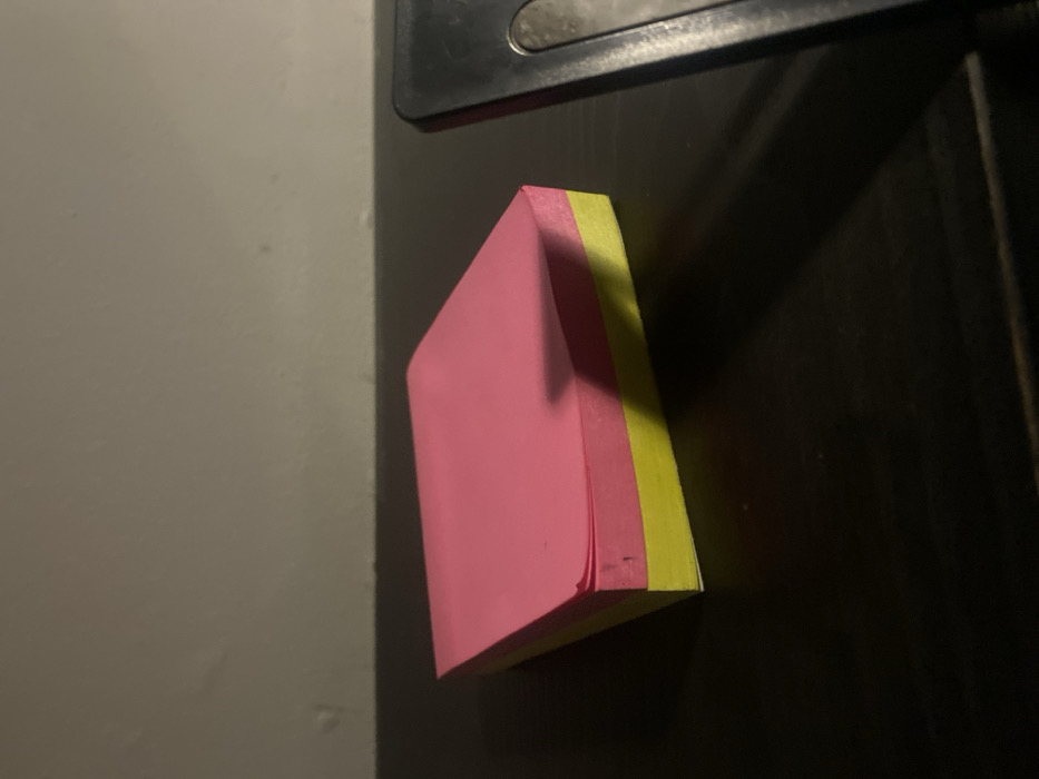 A stack of pink and yellow sticky notes adheres to a dark, possibly metallic surface with a handle visible at the top