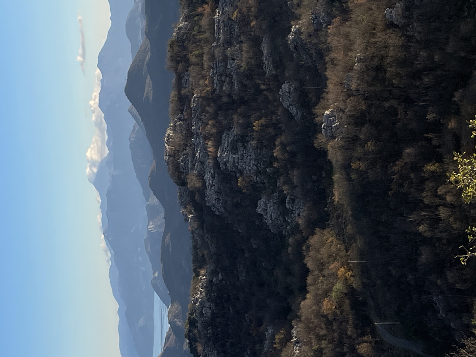 The scene depicts an expansive mountainous landscape in Gornja Brova, Montenegro, under a clear blue sky. The foreground features rugged hills characterized by dense, dark vegetation and numerous exposed light grey limestone rock formations. A narrow, dark asphalt road is visible curving upwards from the lower-left portion of the frame, with two vertical white utility poles positioned alongside it. Patches of vegetation illuminated by sunlight display autumnal yellow-orange hues. The midground consists of successive ranges of blue-tinted mountains, progressively appearing hazier with distance. The background displays a clear blue sky with several scattered small white clouds situated near the peaks of the most distant mountain ranges. A body of calm, light blue water, identifiable as a lake, is discernible on the far left horizon between mountain slopes. Natural daylight illuminates the scene from the left, casting long shadows across the foreground terrain. No human or animal subjects are present.