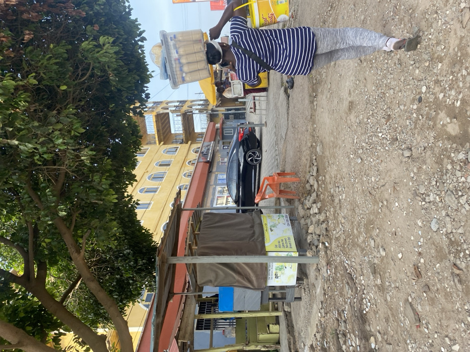 The image depicts an unpaved urban street scene in Accra, Ghana, characterized by a mix of commercial activity and structures. In the foreground and mid-ground, the ground is composed of rough dirt, gravel, and scattered small rocks. A person, identified as female, walks away from the camera towards the right. She wears a blue and white horizontal striped short-sleeved top, light grey leggings, and sandals. A large, clear plastic container filled with multiple light-colored bottled beverages is balanced on her head. A yellow bucket hangs from her left hand, and a black strap (possibly from a bag) crosses her back. To the left mid-ground, a rudimentary street vendor stall with a corrugated metal roof is present. One side is covered by a brown tarp. Two white signs affixed to the front advertise "Akoko Tea & Smoothie" with a Ghanaian phone number (020-006...). An orange plastic chair sits near the stall, beside a pile of loose rocks. Further down, on a paved section of the road, a black sedan is parked. The background is dominated by a multi-story yellow building featuring numerous arched windows and several balconies with metal railings. A sign on the ground floor of this building is partially visible, displaying the word "PRESTIGE". To the right of the parked car, another vendor setup with a yellow umbrella and white tables is discernible, with two indistinct figures nearby. Overhead, a large tree with dense green foliage extends from the upper left, providing shade. The sky is light blue, indicating daytime.