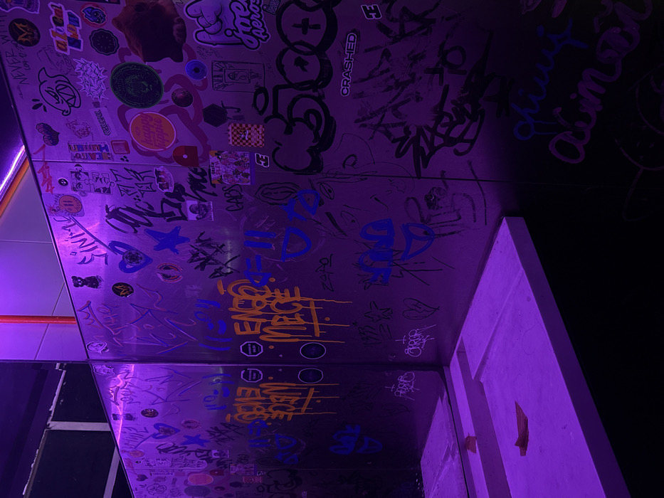 A dimly lit space features walls covered in graffiti and stickers. The walls are primarily dark, with a purple hue from the lighting. A variety of stickers, including circular ones and those with cartoonish designs, are scattered across the surface. Graffiti, ranging from simple tags to more elaborate pieces, adds to the chaotic and urban aesthetic. The space appears to be a small room or alcove, possibly a public restroom, with a door or entrance visible on the right.