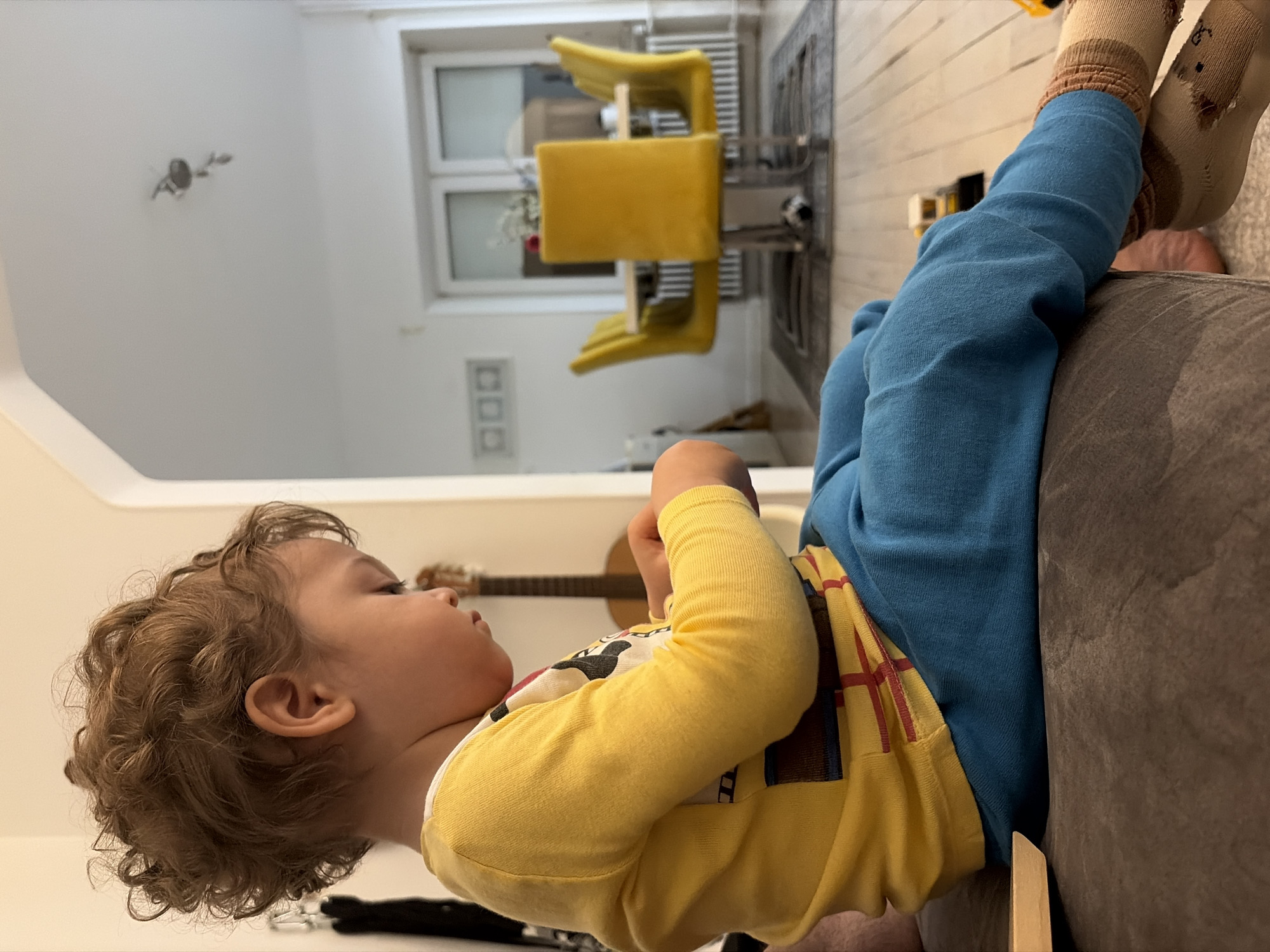 A child is lying on a couch in an indoor environment, possibly a home. The child is wearing blue pants, yellow top and socks. They are lying on their back with their legs extended upwards, resting on the arm of the couch. In the background are yellow chairs, a radiator, a window, a guitar and a light fixture on the ceiling. The location is Pétange, Luxembourg.