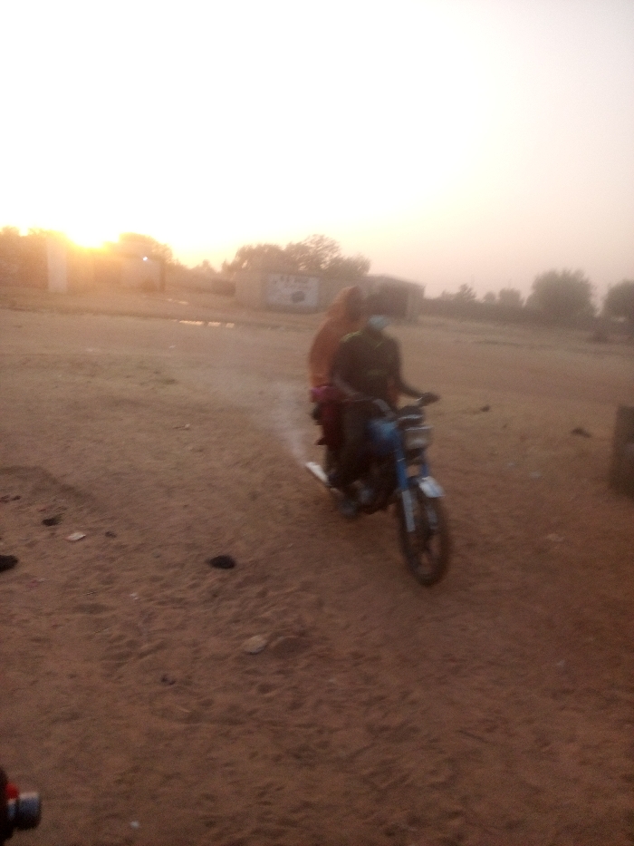 The image displays two individuals on a light-colored motorcycle in an unpaved, reddish-brown dirt area identified as Tudun Murtala, Nigeria
