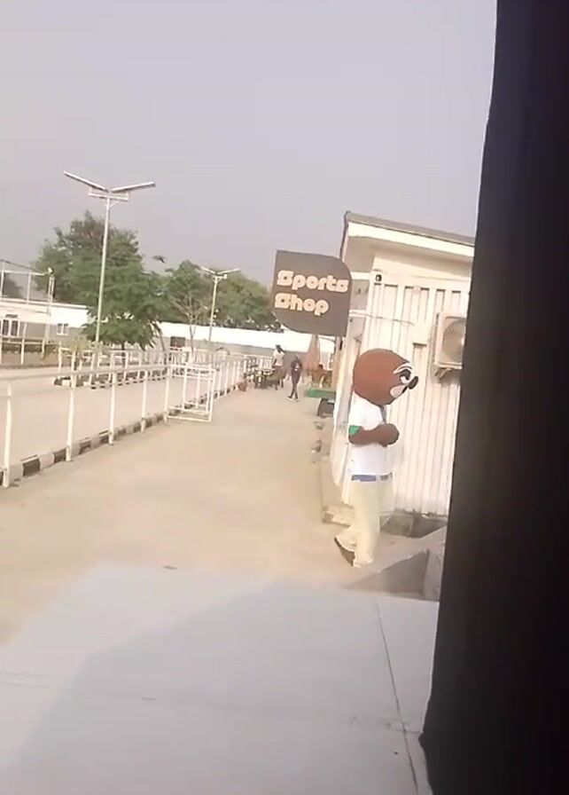 person in a cartoon mascot costume walking along a walkway that leads to a building with a "Sports Shop" sign. The walkway has white guard rails with black and white curbing. There are lamp posts along the walkway and a sports field in the distance. The video is shot from a low angle and the cameraman moves along the walkway.