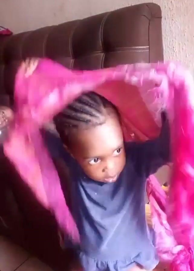A young child with dark hair and brown eyes is playing with a pink, patterned scarf in front of a brown leather headboard. The child is wearing a long-sleeved blue shirt and no pants. They put the scarf over their head, obscuring their face, then arrange it as a hat on their head. Another small child is visible in the background, lying on a sofa against the headboard. The floor is tiled in a beige pattern. The wall is light-colored and textured.