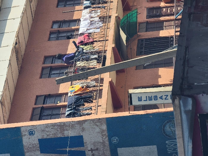 An exterior image depicts a multi-story building in the city of Maiburiji, Nigeria. The building features peach-colored textured walls and multiple dark-framed windows, some with security grilles. An upper-floor balcony with an ornate metal railing displays numerous articles of clothing of various colors hanging to dry. One individual, wearing a dark shirt, stands on this balcony, holding a long, dark object, and appears to be looking towards the right side of the frame. A partial view of another person is faintly discernible further right on the balcony. Below, a green, translucent corrugated plastic awning extends from the building wall. In the foreground, a prominent blue-painted vertical structure with faded white text, including a large "M" and "1980", is visible on the left. A light-colored utility pole leans diagonally through the central foreground, partially obscuring the building. Attached to this pole are utility wires. Directly below the utility pole, a vertical white sign with blue text reading "ELEGANT" is present. The immediate foreground consists of a dark, low-lying structure. The scene is illuminated by bright daylight.