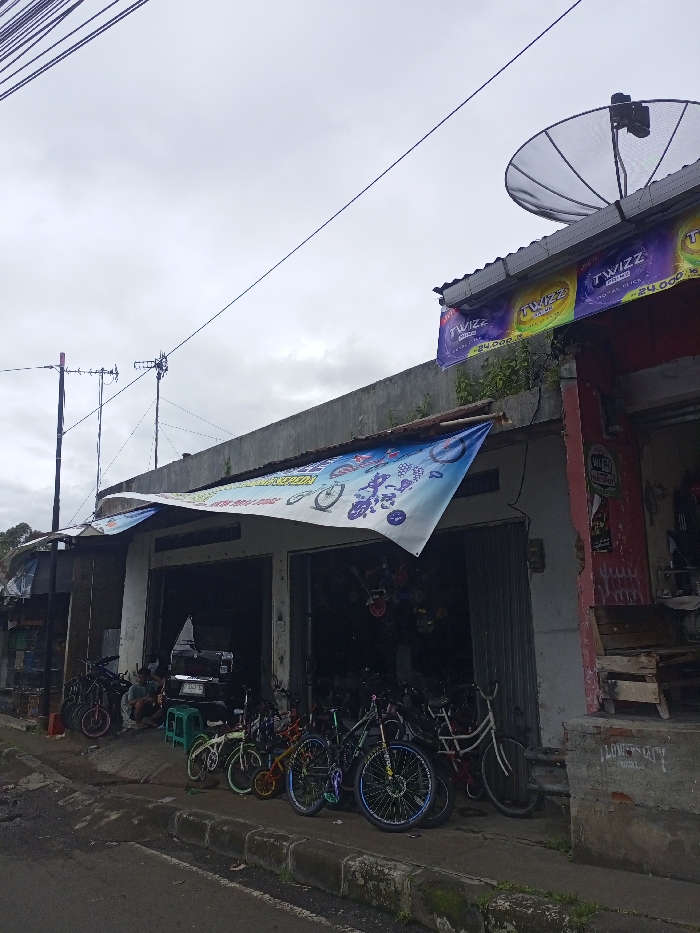 A low-angle shot captures a bicycle shop under a cloudy sky. Bicycles crowd the storefront, lined along the sidewalk. A banner is hung over the entrance with blue, white, and grey colors. A satellite dish is mounted on the roof of the building on the right of the image. Utility poles are visible in the sky.
