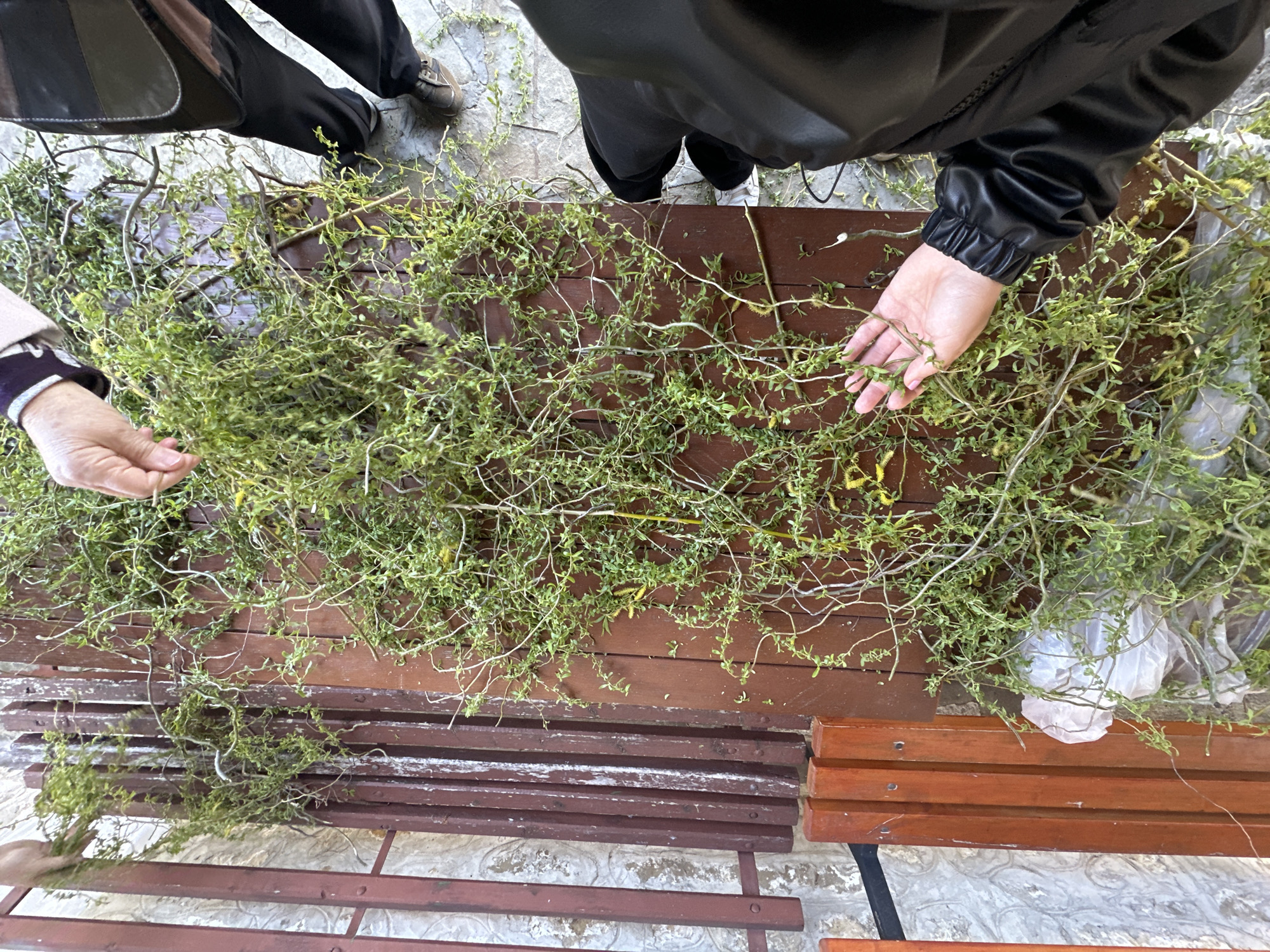 Captured from an elevated perspective, the image showcases two people situated around a wooden surface laden with verdant foliage interspersed with slender branches bearing yellow buds. One individual, visible on the left, dons dark trousers and a light jacket, complemented by a dark handbag. The second person, positioned on the right, is clad in dark trousers and a black jacket, with the edge of a black glove visible. Both are apparently handling the foliage on the wooden surface. The wooden surface appears to be composed of stacked planks, with an adjacent section presenting as a typical wooden bench. A clear plastic bag rests nearby. The location is not discernible from this image.