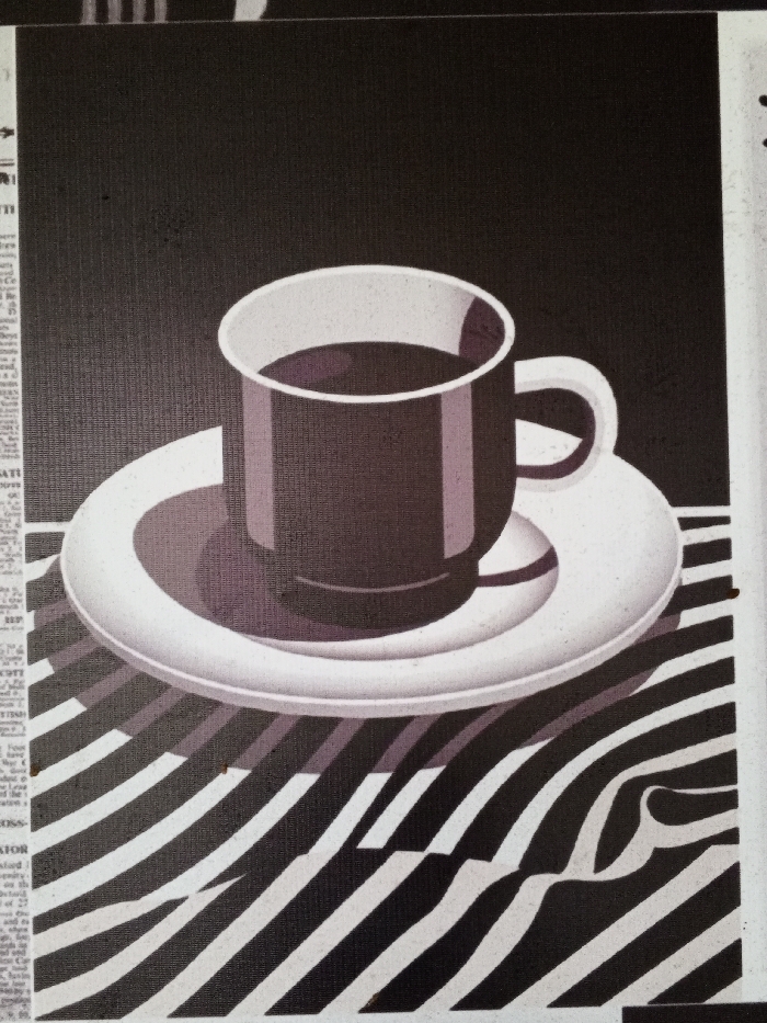 The image displays a stylized, high-contrast graphic illustration of a full cup on a saucer