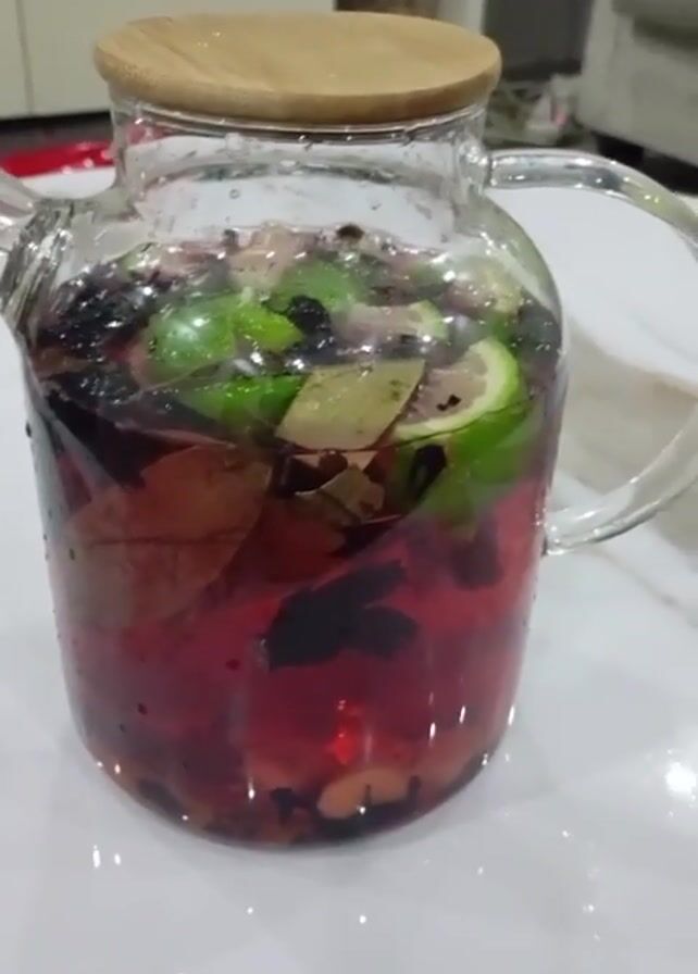 transparent glass teapot with a wooden lid filled with a red liquid, green lime or lemon slices, and various other plant-based ingredients