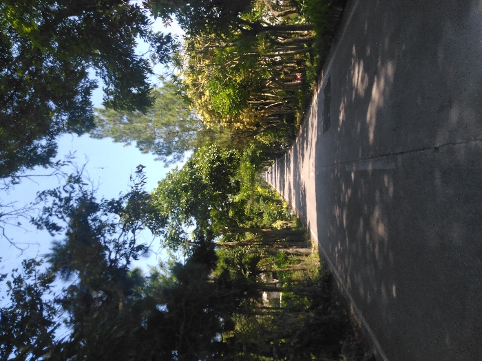 The image displays a long, straight, asphalt road located in Siquisique, Venezuela. The road is bordered on both sides by dense, verdant trees that form a partial canopy overhead. A faded white broken line marks the road's center, and a solid white line defines the right shoulder in the foreground. Sunlight filters through the foliage, creating numerous dappled shadows on the dark grey asphalt. The environment includes a clear blue sky visible through gaps in the tree cover, with various tree species, including tall, slender evergreens, contributing to the dense vegetation. The road extends into the distance, devoid of visible people, vehicles, or significant man-made structures.