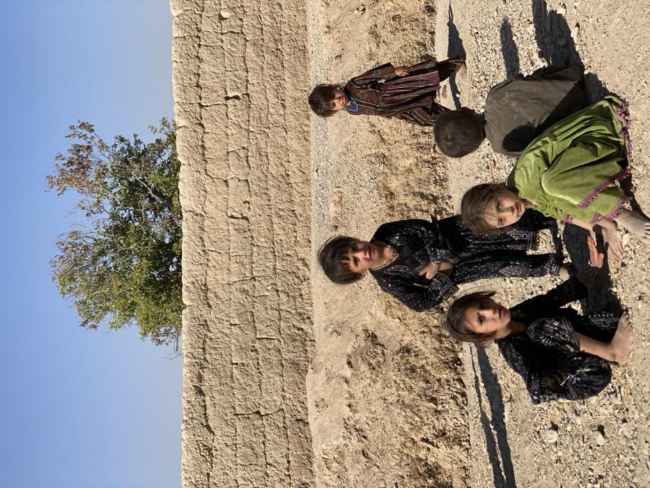 The image depicts five children in an outdoor, arid environment within the city of Unknown, Unknown