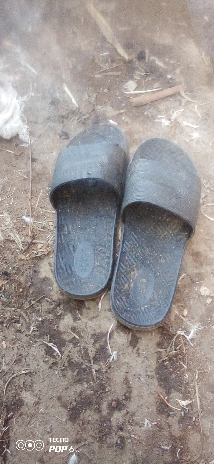 - "The scene, located in Mahiakalo ward, Kenya, depicts two black slide sandals resting on dry, disturbed earthen ground" by FM-w9T4h1, licensed under CC BY 4.0