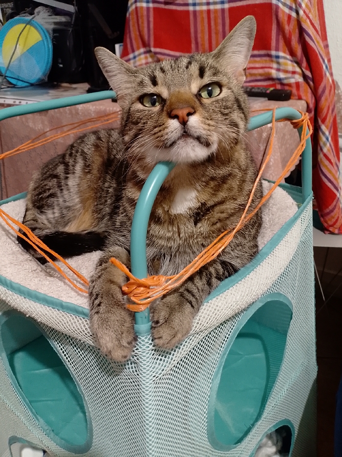 - "A tabby cat sits perched within a turquoise and white mesh storage cube" by FM-5n8Vg2, licensed under CC BY 4.0
