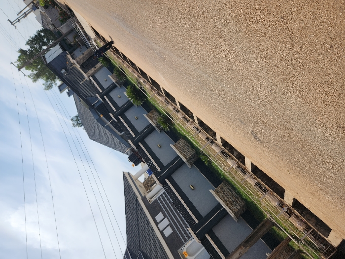 The image displays an outdoor, daytime street scene in the city of Unknown, Unknown, captured at a significant tilt. A light brown, possibly gravel or textured asphalt road occupies the lower and right-center of the frame, receding into the background. Along the left edge of the road, a low, white metal fence with horizontal bars separates the thoroughfare from a green grassy verge. Below this fence, a series of dark, rectangular concrete elements are embedded in the ground. To the left of the road and fence are two residential properties enclosed by a high perimeter wall. The wall features a base of light-colored, stone-like cladding, a dark gray lower section, and a lighter gray upper section, punctuated by decorative vertical columns. Within the property boundary, small green shrubs are visible. The houses themselves are modern, two-story structures with prominent dark gray tiled roofs and light-colored accents on their facades. The house in the foreground displays several rectangular white-framed windows. One individual is observed standing or slowly walking on the right side of the road, in the mid-ground, clad in dark clothing, facing away from the camera. Specific features are indistinct. The sky above is light blue with scattered white clouds, traversed by thin black overhead power lines. Several utility poles are visible further down the street on the right. Green trees are present in the background, behind the houses. The scene is brightly illuminated by natural sunlight, indicated by visible shadows.