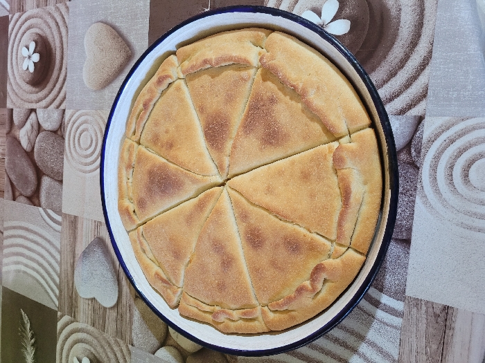 - "An overhead view depicts a golden-brown baked pastry, divided into eight triangular slices, resting within a white enamel pan with a dark blue rim" by FM-laGG22, licensed under CC BY 4.0