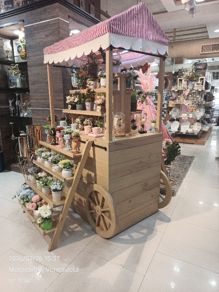 An indoor scene within a retail establishment in Maracaibo, Venezuela, is depicted. The central subject is a light-colored wooden display cart, approximately two meters in height, featuring two large wooden spoked wheels. A peaked canopy with alternating white and red vertical stripes, edged with a scalloped white trim, covers the top section of the cart. The cart itself is structured with multiple internal shelves displaying numerous small potted artificial plants and flowers in varied pastel colors, including pink, blue, white, green, and purple. Among these, pink ceramic mugs, small metallic vases, and glass cloches enclosing floral arrangements are also visible. An auxiliary, multi-tiered wooden shelving unit, resembling a small ladder, extends horizontally from the left side of the main cart, also stocked with artificial potted flowers. To the left of the cart, a dark, vertical pillar-like structure is visible, alongside glass shelving holding decorative items such as metallic lanterns and silver deer figurines. To the right, a retail store aisle extends into the background, lined with light-colored wooden shelves laden with various household goods, including clear glassware and white ceramic items like plates and bowls. A small, textured, brownish rug lies on the tiled floor to the right of the cart. The floor throughout the visible area is composed of large, light-colored square tiles. The scene is illuminated by artificial overhead lighting, casting distinct shadows from the cart and other objects onto the floor. No individuals are clearly identifiable within the frame, though a partial view of a foot or shoe is discernible on the far right, implying a person's presence in the store aisle. A digital timestamp "2026/02/26 15:57" and the location "Maracaibo, Venezuela" are overlaid in white text in the bottom-left corner.
