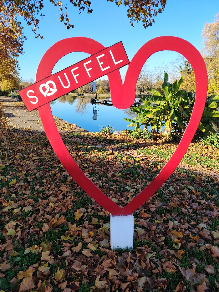 An outdoor autumnal scene depicts a large, red, heart-shaped monument positioned on a grassy area covered with numerous fallen yellow and brown leaves. A red rectangular plaque, featuring a white pretzel icon followed by the word "SOUFFEL" in white capital letters, is horizontally affixed across the upper left curve of the heart. The heart is supported by a visible white rectangular base at its bottom center. Behind the monument, a calm body of water, likely a canal or pond, reflects the clear blue sky and distant trees. A wooden dock extends into the water from the left, with two white and black rectangular markers visible near it. To the right of the water and within the heart's opening, dense green foliage, including large banana-plant-like leaves, is present. A paved path lines the left bank of the waterway, with trees displaying yellow and brown autumn leaves. Further in the background, additional deciduous trees with sparse foliage line the horizon under a bright blue sky. Overhanging branches with autumn leaves are visible at the top of the frame. The location is identified as within the city of Souffelweyersheim, France, likely adjacent to the Souffel river or a related waterway, as indicated by the prominent "SOUFFEL" signage. No individuals or active subjects are present in the scene.