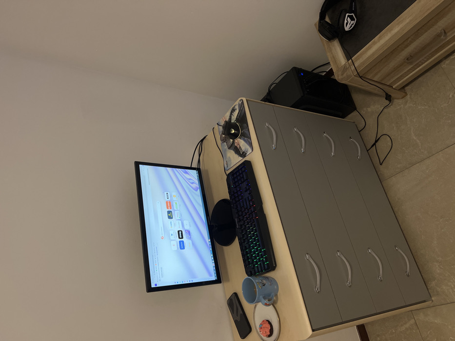 The scene depicts an indoor corner workstation within a building in Wegnez, Belgium. A light-colored, five-drawer dresser with gray drawer fronts and clear curved handles serves as a desk. On its top surface, a black computer monitor, a black RGB-backlit keyboard, and a black gaming mouse on a character-themed mousepad are arranged. The monitor displays a web browser interface with multiple shortcut icons and a purple-blue abstract background. To the left of the keyboard are a black smartphone, a light blue mug with a cartoon character design, and a small white plate holding a single cupcake with pink frosting and sprinkles. A black computer tower with an illuminated blue light is situated on the tiled floor to the right of the dresser. Adjacent to the computer tower on the right, a second piece of light wood furniture with a dark top holds a pair of black over-ear headphones. Black cables are visible connecting the electronic components and extending across the tiled floor. The walls are plain and light-colored. No individuals are present.