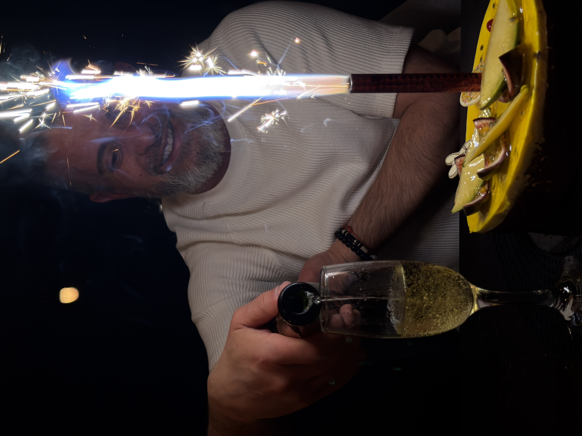 A forensic description of the scene depicts an adult male in an indoor or nighttime setting in Junglinster, Luxembourg. The man, with grey hair and a beard, is smiling and wearing a white, ribbed short-sleeved shirt. His right hand is actively pouring a sparkling, light-yellow liquid from a dark-colored bottle into a clear champagne flute, which is approximately half-full with the bubbly beverage. To the right of the champagne flute, a yellow-colored dessert or cake is positioned on a yellow, oval-shaped platter. The dessert is garnished with slices of what appear to be mango and halved passion fruit, along with a few small red berries. A lit pyrotechnic sparkler, typically a cake fountain, is inserted vertically into the dessert, emitting bright white and gold sparks upwards and to the sides, creating smoke. The sparkler's base is dark reddish-brown. The background is predominantly dark, with a singular, out-of-focus, yellowish-orange light source visible in the upper left portion of the frame, possibly a distant light or the moon. The overall lighting is dim, highlighting the subjects and actions.