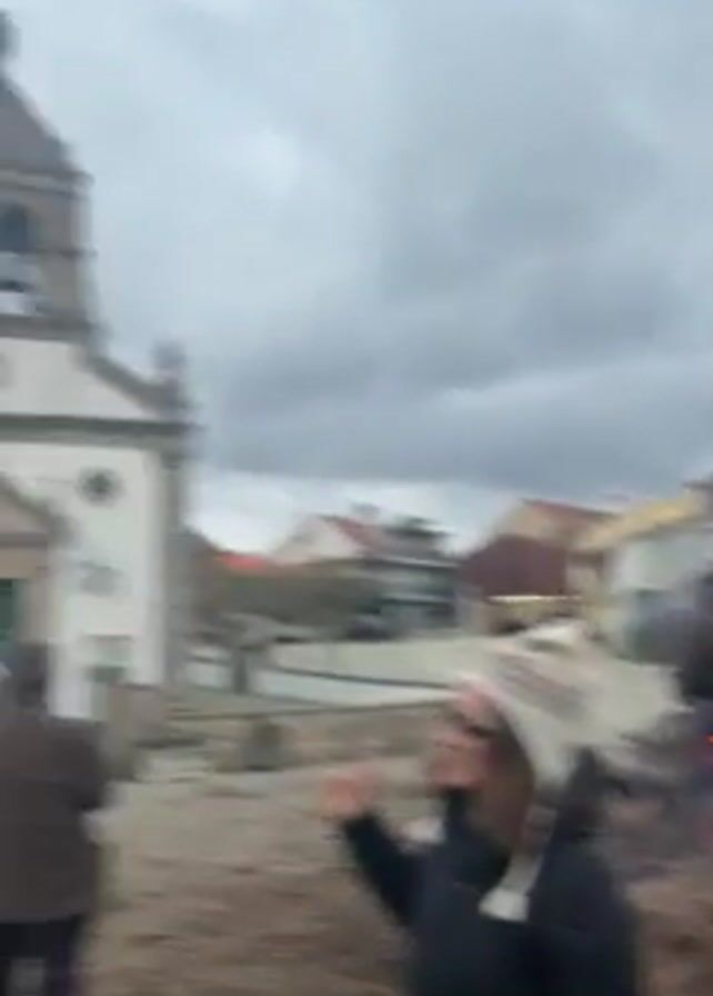 young person with blonde hair wearing a black hoodie walking in front of a pile of burning debris. The debris appears to be composed of charred wood and other materials, with visible flames and glowing embers. The background is overcast, with a glimpse of a building in the distance. The camera movement is unsteady, suggesting handheld recording.