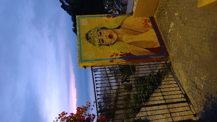 This image depicts a coastal outdoor scene in Barranco, Peru, at twilight. The foreground features a paved walkway composed of interlocking rectangular dark grey blocks, partially illuminated by an unseen artificial light source, with minor debris scattered on the surface. To the right, a prominent mural is painted on a yellow, rectangular wall section. The mural portrays a woman with long, voluminous blonde hair and bangs, fair skin, and full red lips, with her right index finger touching her chin/mouth. The mural's background is yellow with streaks of red and blue paint, and it bears the red signature "Díaz" in the lower right. A black metal fence with vertical bars extends across the midground, running parallel to the viewer and separating the walkway from a lower vegetated area. Red flowering vines with green leaves are visible in the upper left corner, draped over the fence. Beyond the fence and foliage, the dark expanse of the Pacific Ocean is visible, meeting a horizon marked by a faint pink and purple glow. The sky above transitions from a light blue near the horizon to a darker blue overhead, indicative of dusk. Dark green, tree-covered hills are visible on the far right, silhouetted against the twilight sky. No individuals are present in the scene.