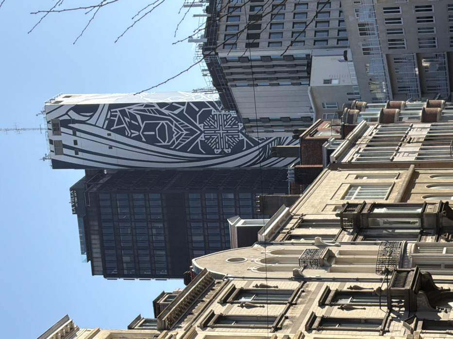 This forensic description details an urban landscape in Ixelles - Elsene, Belgium, focused on the IT Tower at Avenue Louise. The image, captured in clear daylight under a bright blue sky, features a multi-layered architectural composition. In the immediate foreground on the left and spanning the lower half of the frame, a row of historical multi-story residential buildings is visible. These structures exhibit traditional European architectural characteristics, including beige and light brown stone or stucco facades, ornate window frames, decorative balconies with wrought-iron railings, bay windows, and visible rooftop elements like chimneys and dormers. No individuals or discernible activities are present in this section. Dominating the mid-ground and background are several prominent high-rise buildings. A tall, dark-colored, rectangular skyscraper, the IT Tower, stands centrally, its upper section displaying a "LA VILLA IN THE SKY" sign. Adjacent to and partially overlapping this dark facade, another side of the IT Tower is prominently featured, adorned with a large, vertical, black-and-white mural. This mural depicts a highly stylized, abstract, and geometric pattern that resembles a cloaked figure or totem. To the right, additional multi-story modern buildings with numerous windows contribute to the urban skyline. The upper right portion of the frame is partially obscured by bare tree branches. The scene is illuminated by strong natural light, indicating a sunny day.