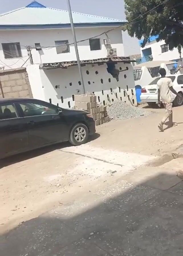 The video captures a street scene on a sunny day, with a black car parked on the left side of the frame. In the background, there's a white building with a blue roof and a white car parked next to it. There are stacks of bricks and a pile of gravel near the building. Two people are walking away from the camera, moving from left to right across the frame. One is wearing light colored clothing. There is a tree near the building, and the ground appears to be a mix of dirt and concrete. A lamp post is also visible in the scene.